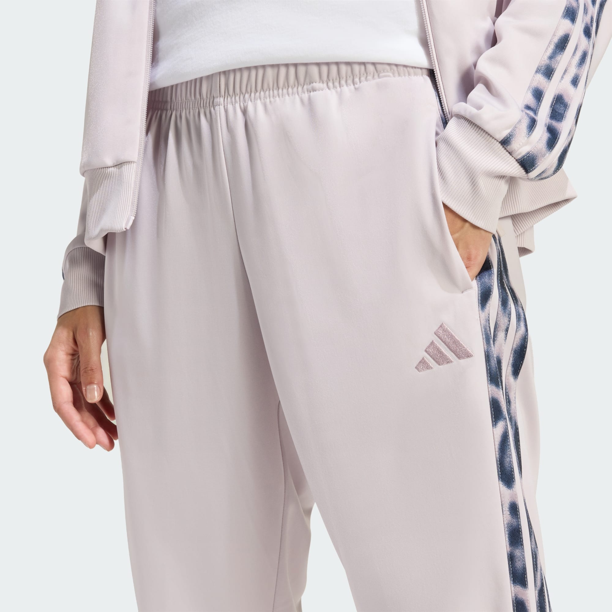 3-Stripes Leopard Print-træningsdragten har et moderne fit med et strejf af tradition og er designet til ubesværet at passe ind i din garderobe. De ikoniske tre striber med leopardfyld giver dit look et legende twist og gør det til et iøjnefaldende valg uanset lejligheden. Dette træningssæt i trikot lover komfort og holdbarhed, så du har det godt, uanset om du er ude på en afslappet gåtur eller mødes med venner. Den er designet med praktiske detaljer i tankerne, og den fulde lynlås midt foran gør den nem at have på, og standardpasformen giver dig bevægelsesfrihed uden begrænsninger. Den mellemhøje talje og de koniske, almindelige indersømme giver en flatterende silhuet, mens det broderede tre-bar logo tilføjer et strejf af adidas-arv. Omfavn sportstøjets ånd med dette tracksuit, hvor stil møder funktion i hver eneste syning.