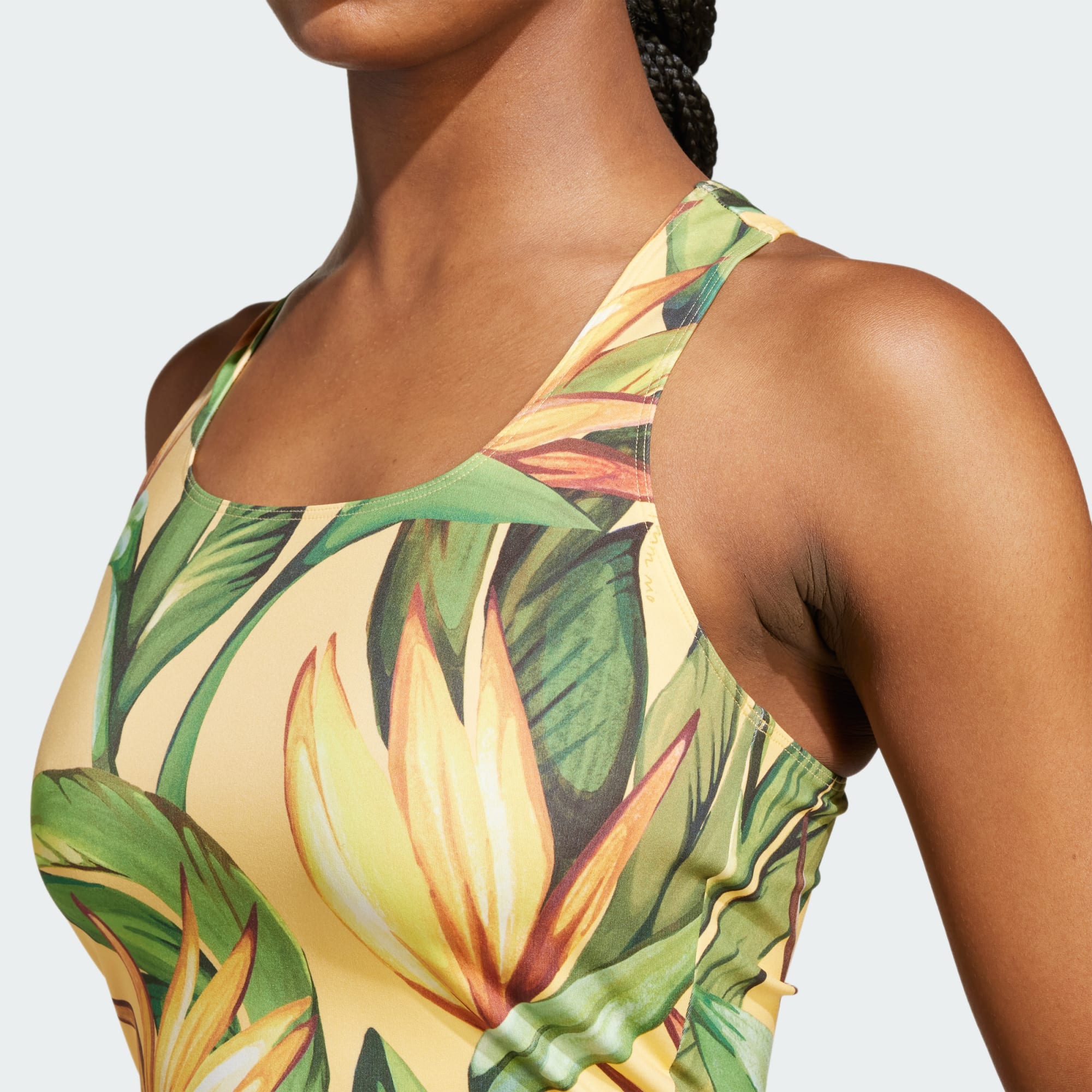 Denne tanktop fra adidas kombinerer FARM Rio's karakteristiske tropiske vibes med dyreprint og ikatprint for at skabe et eksotisk look inspireret af ørkenens skønhed. Den slanke pasform og bryderryggen giver dig fuld bevægelsesfrihed til konditionstræning eller styrketræning. CLIMACOOL leder sveden væk for at holde dig afkølet, tør og uforstyrret.