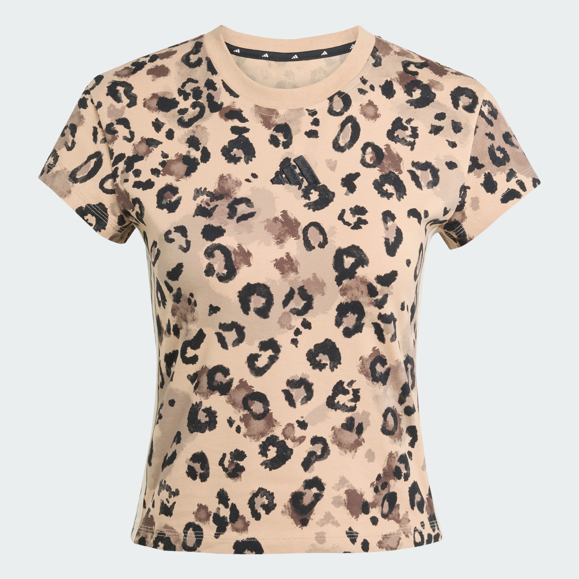 This adidas tee brings a playful edge to a classic silhouette. Leopard-print details add a touch of attitude. Made of soft cotton jersey with a bit of stretch, it's cut for a comfortable fit that layers easily. An embroidered adidas Badge of Sport logo on the back signs off the look.