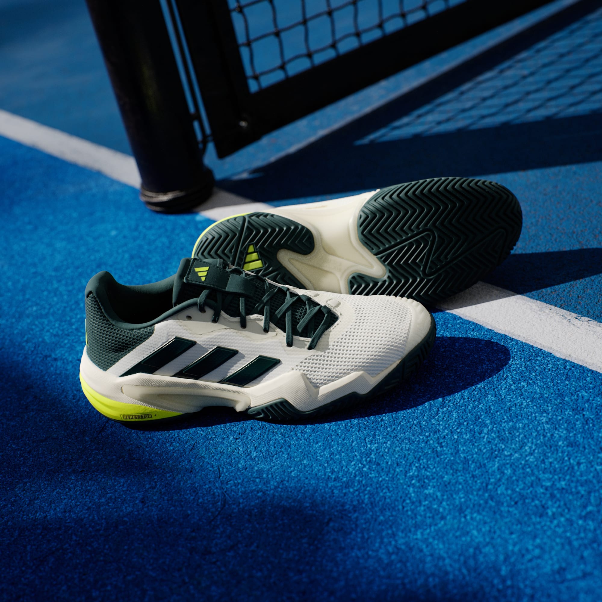 Tag kontrollen på banen i disse Barricade-tennissko fra adidas. Torsion System giver kampafgørende stabilitet, mens det asymmetriske snøresystem låser fødderne fast til hurtige retningsskift og udskridninger. En REPETITOR-mellemsål giver støtte og jævne overgange fra skridt til skridt. Geofit Sensepods følger din hæls naturlige form og sikrer komfort og støtte hele vejen til matchpoint.