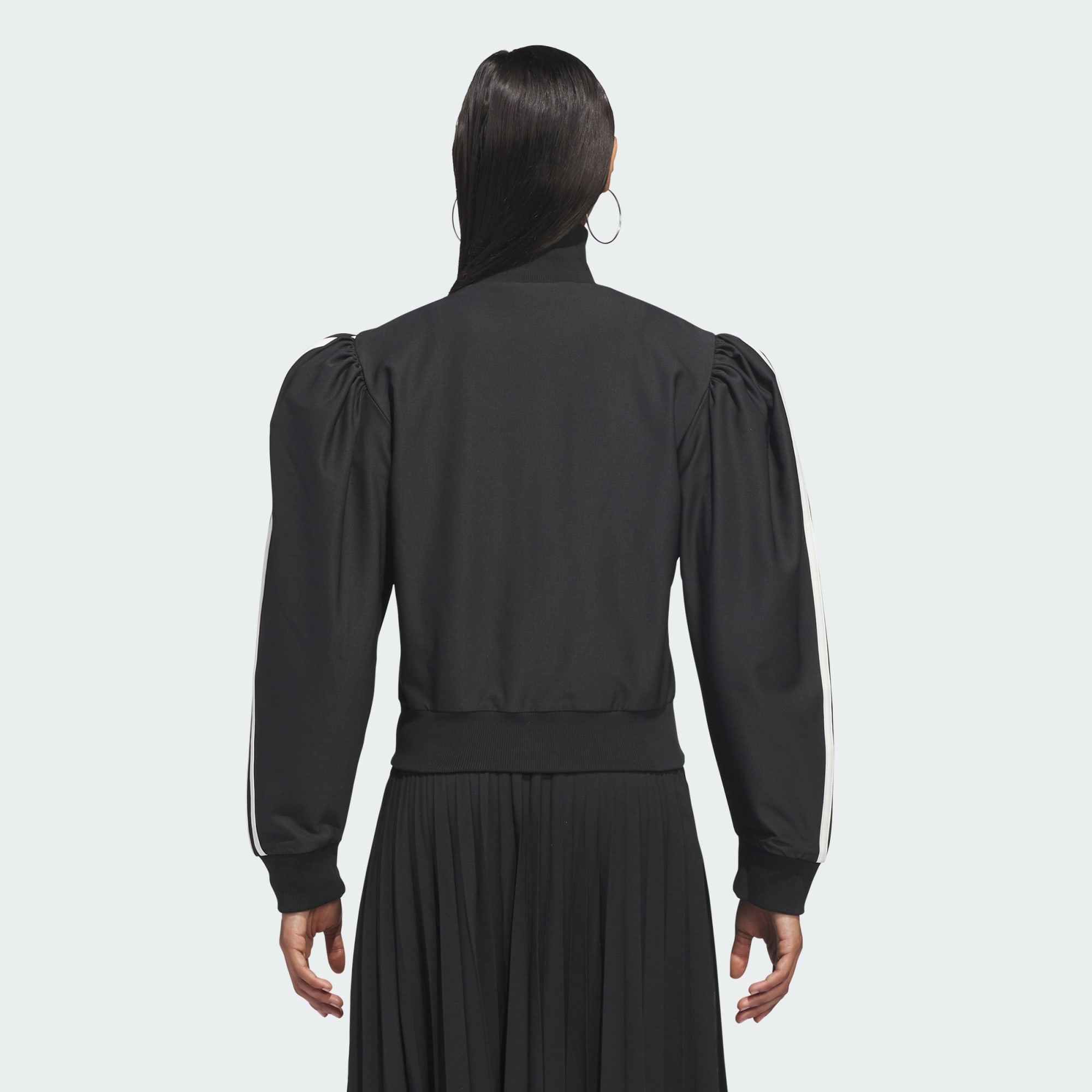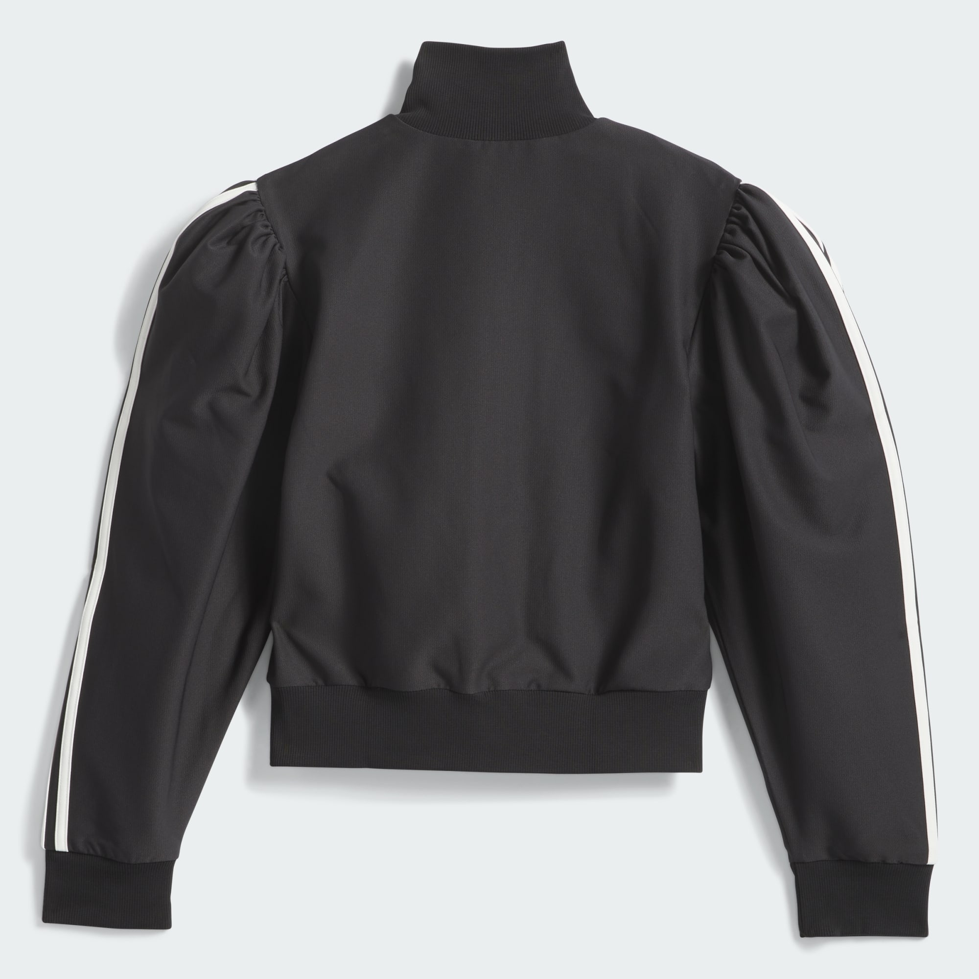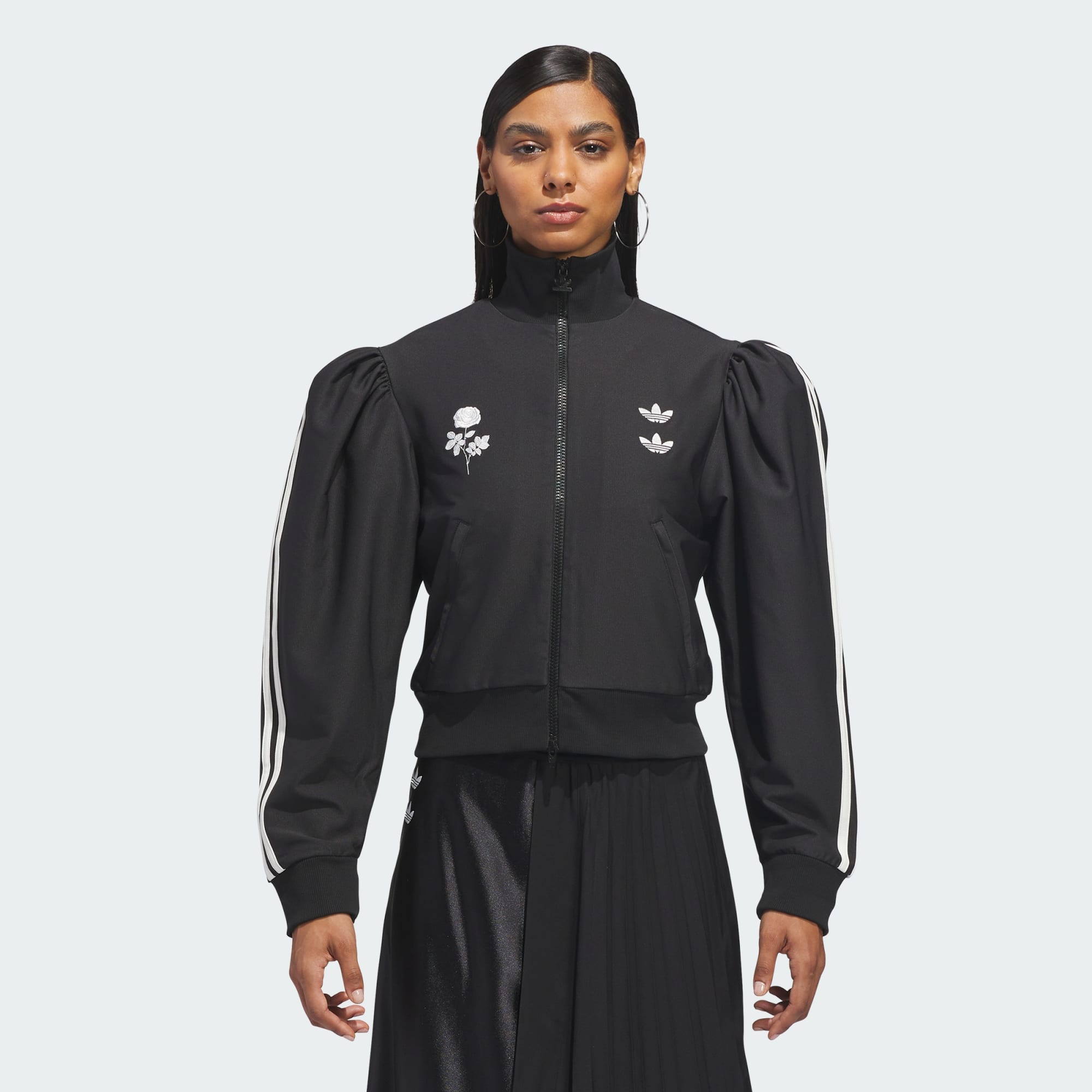 Chavarria Blouse-træningsjakken er fremstillet af genanvendt polyester-twillstof for at give enestående kvalitet og holdbarhed. Træningsjakken er designet til at sidde tæt på kroppen med overdrevne pufærmer. Blandt de funktionelle detaljer er en ribstrikket krave, opslag og kant. På kroppen er der to forlommer med kantbånd. Mærkerne består af dobbeltbroderede Trefoil-logoer på venstre side af brystet og en broderet rose på højre side af brystet. 3-Stripes-mærke er påført langs begge skuldre og ærmer.