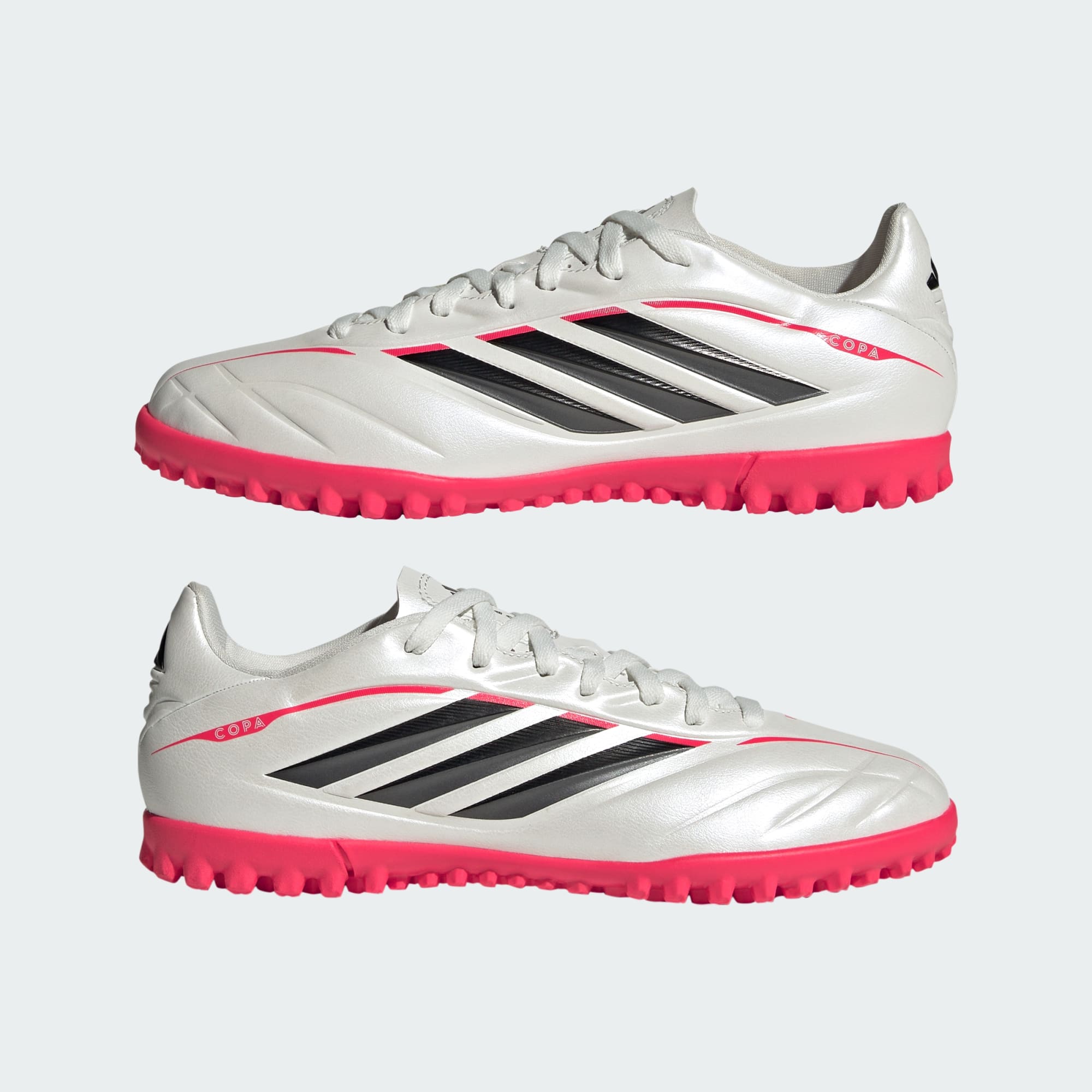 Copa Pure IV Club Turf-fodboldskoene til børn er lavet til unge spillere, der elsker spillet. Disse sko giver banen et strejf af klasse og kombinerer komfort, boldfølelse og pasform i et moderne design. Med en syntetisk overdel tilbyder de holdbarhed og fleksibilitet, og de tilpasser sig fodens form for en personlig pasform. De haptiske 3D-print forbedrer grebet i bolden og giver børnene selvtillid til at skyde. Ydersålen i gummi er designet til kunstgræsbaner og giver greb på korte syntetiske fibre, hvilket giver stabilitet under spil. Den polstrede indersål med en svangindsats giver komfort og støtte, hvilket gør disse sko fantastiske til lange timer på banen. Snør COPA PURE IV CLUB på, og lad dit barn opleve glæden ved fodbold med adidas, hvor arv møder innovation.