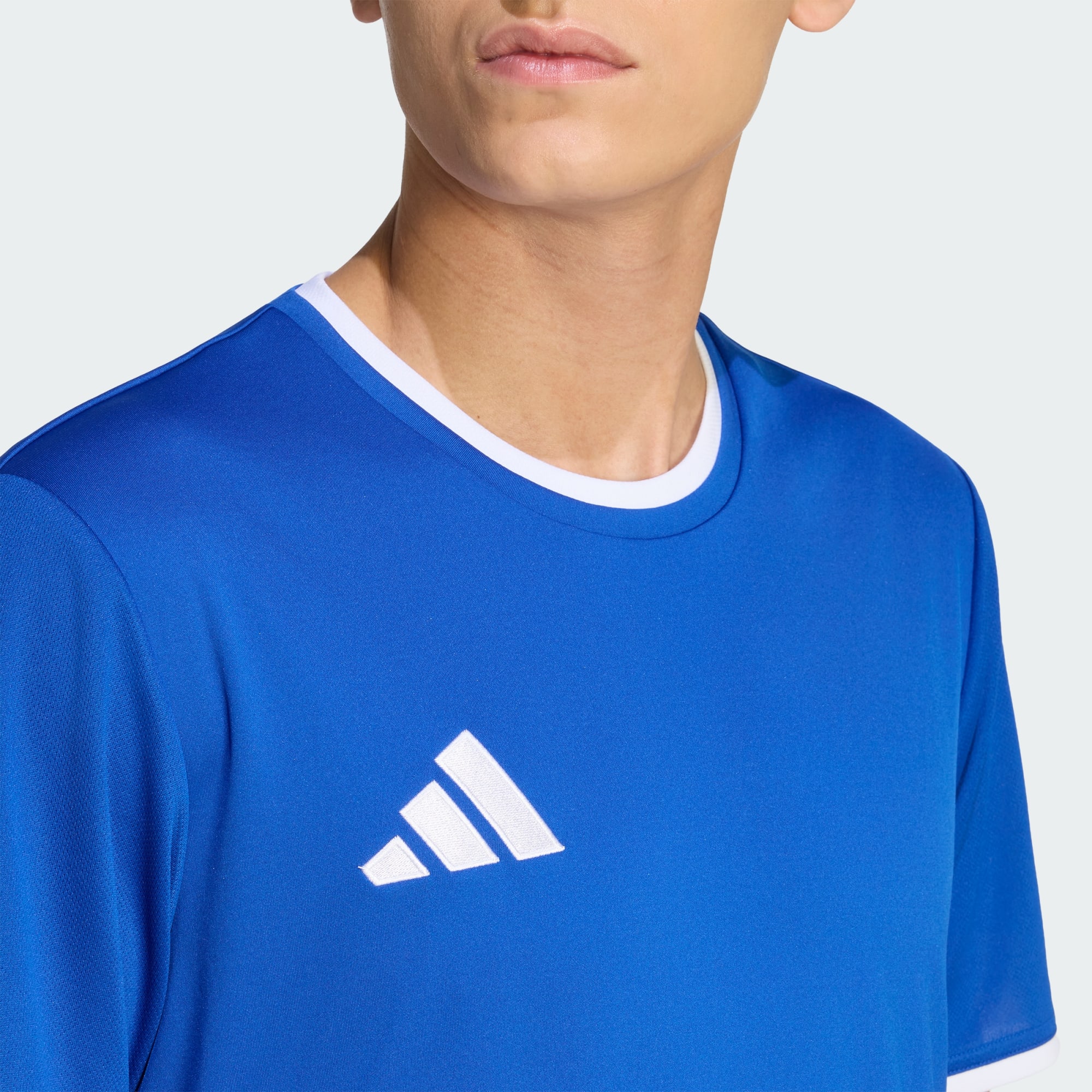 Den runde halsudskæring giver fodboldtrøjen et klassisk look, og det broderede Badge of Sport afspejler adidas' sportsånd og kvalitet.