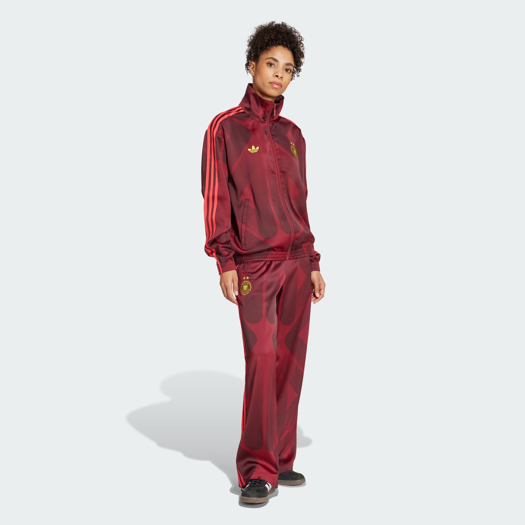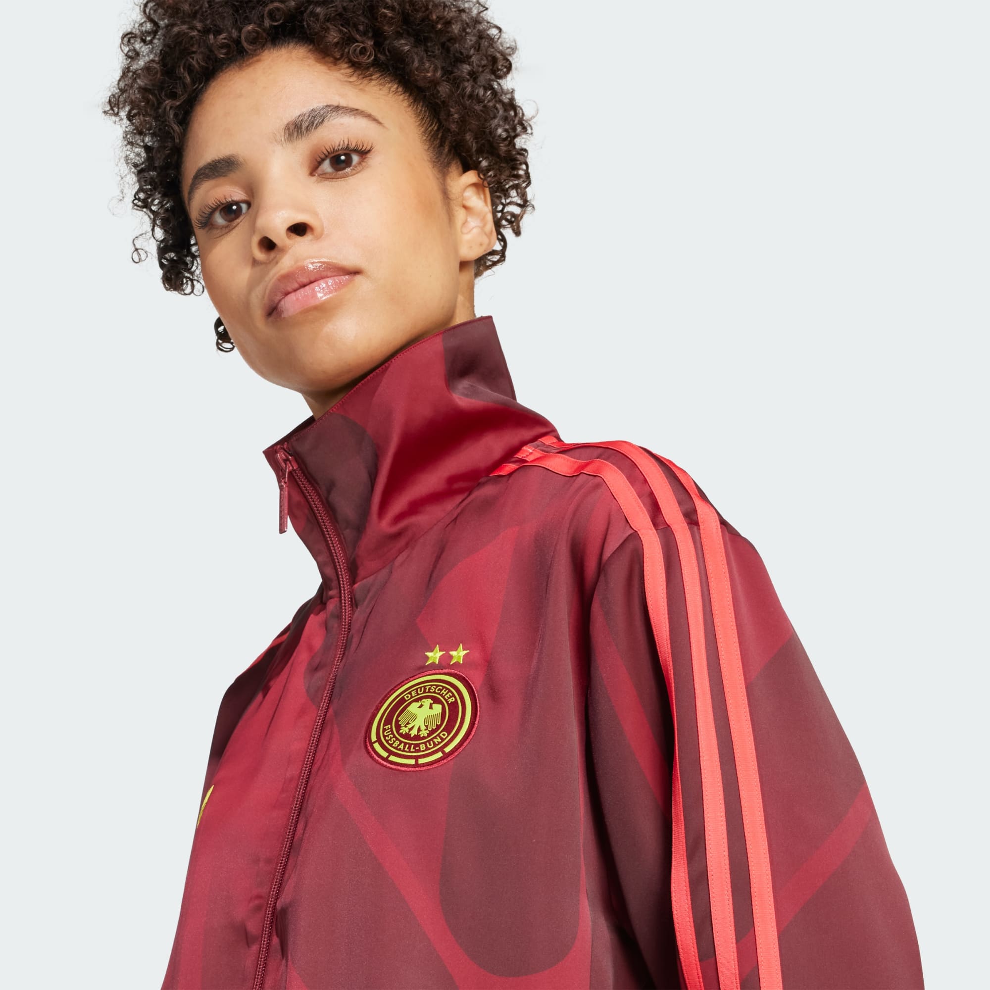 Denne træningsoverdel fra adidas stammer fra sport, men handler om stil. Den er fremstillet af satinmateriale med et glansfuldt look, og hører lige godt hjemme på banen og i byen. En Trefoil og Tysklands kvindeholdsmærke på brystet skiller sig ud fra de bordeauxrøde farver på holdets udebanesæt.
