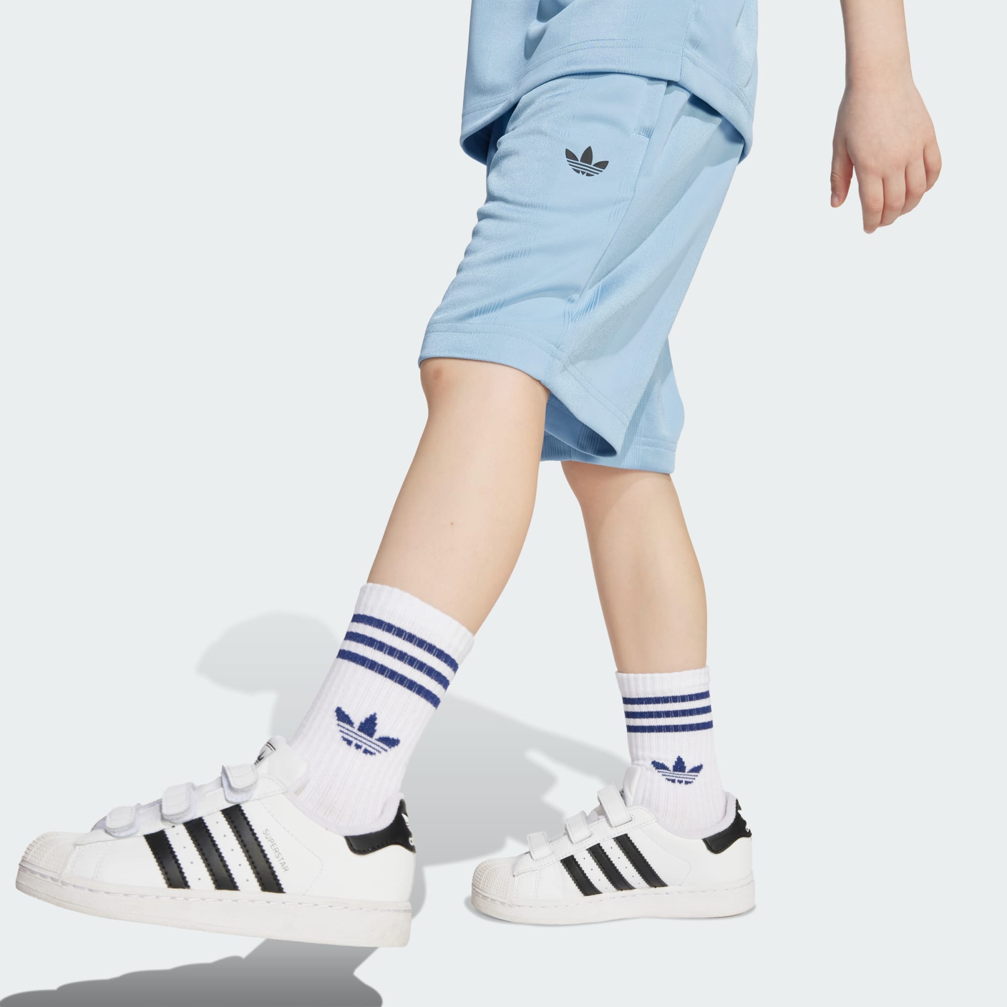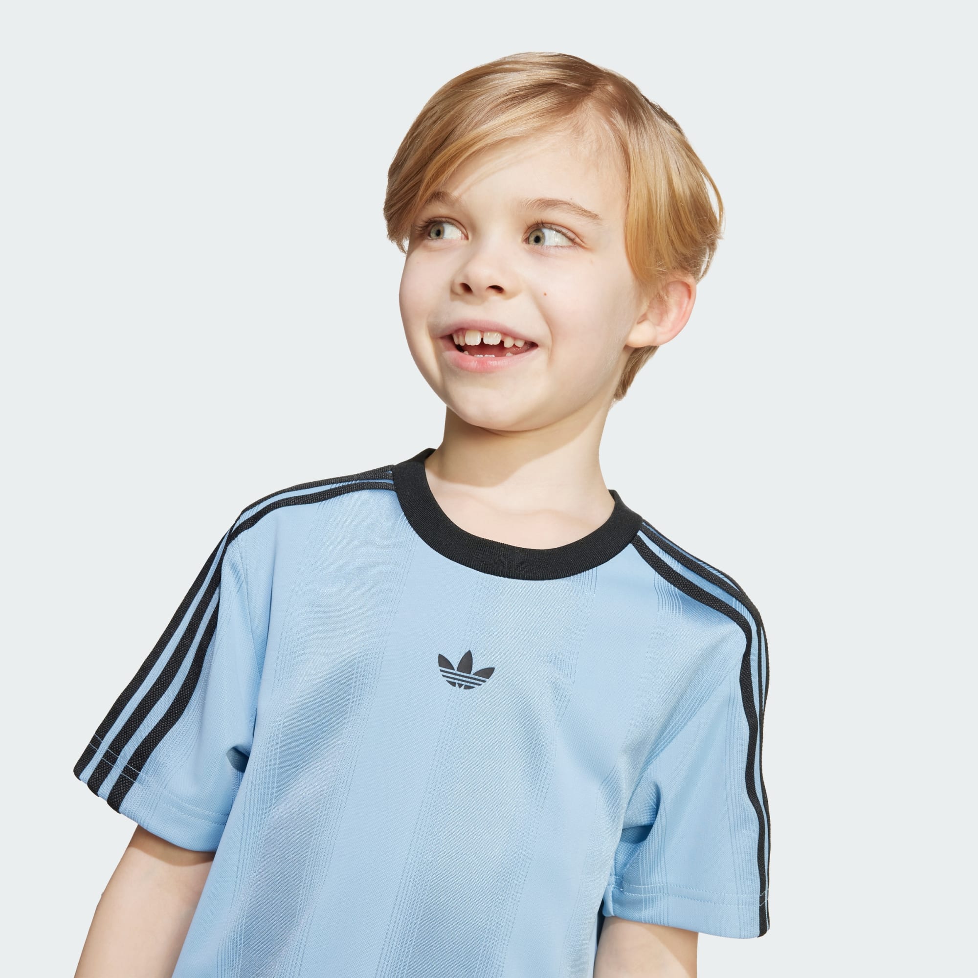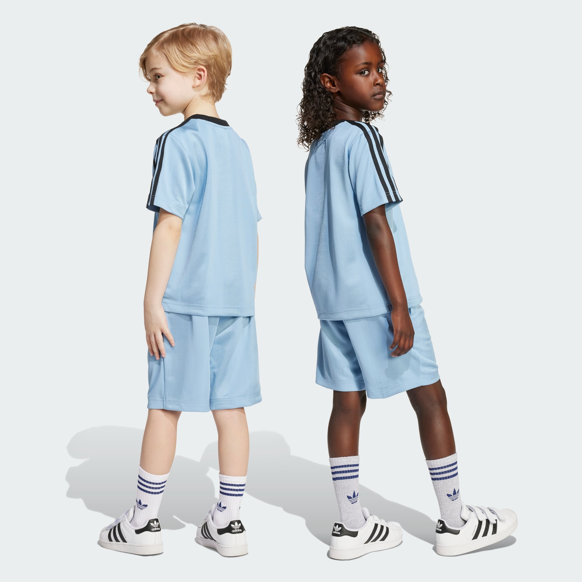 Dette adidas-sæt lader børnene vise deres kærlighed til det smukke spil. Den har en T-shirt og shorts, der handler om afslappet komfort. Det bløde, strikkede jacquard-stof holder dem veltilpasse igennem deres travle dage. 3-Stripes og Trefoil-logoer holder looket rodfæstet i adidas-arven.