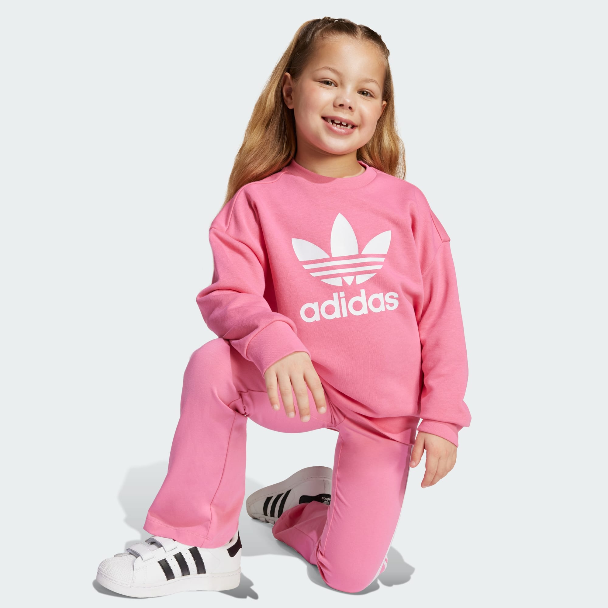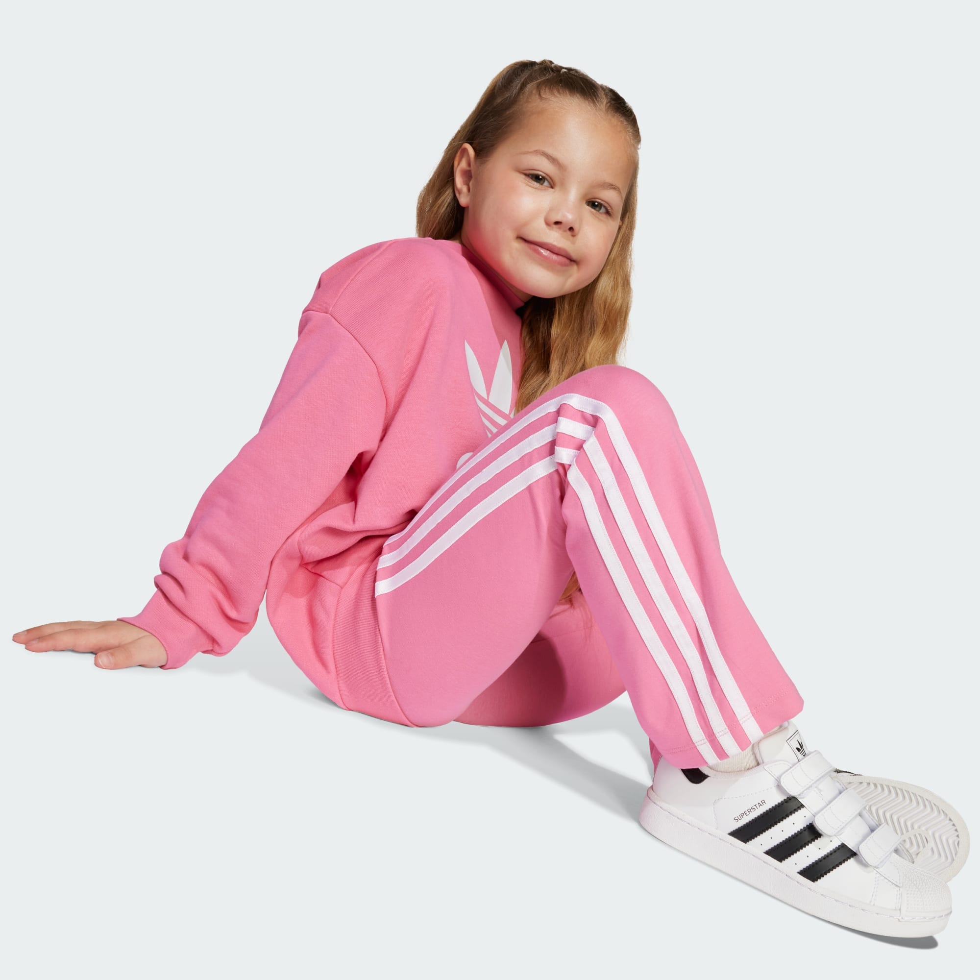 Markant adidas Originals identitet til børn, der elsker at rocke Trefoil. Dette todelte leggingssæt til børn inkluderer en top med rund hals og løs pasform, som er nem at tage på og giver dem masser af plads. De matchende stramme leggings flagrer rundt om anklerne og har et elastisk taljebånd for en perfekt stretchy pasform. Begge dele er lavet af blødt frottéstof af fransk terry. Brug det som et sæt, eller mix og match stykkerne med andet tøj.