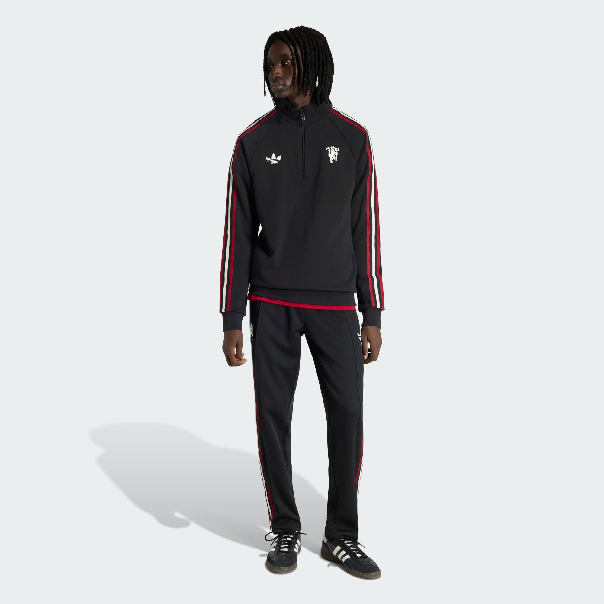 Tilføj lidt retro-fodboldcharme til din garderobe med Manchester United Originals Half Zip-overdelen. Denne sweatshirt har et design med et vintage farveskema og er en hyldest til klubbens omfangsrige arv. Denne sweatshirt er lavet af frotté og har en fyldig og blød fornemmelse, der er fantastisk til køligere kampdage. Designet med halv lynlås tilføjer et strejf af alsidighed, så du nemt kan justere dit look og komfortniveau. adidas Trefoil-mærket pryder toppen og symboliserer vores engagement inden for kvalitet og stil. Bær arven fra Manchester United, og fremvis stolt din loyalitet med dette ikoniske stykke tøj.
