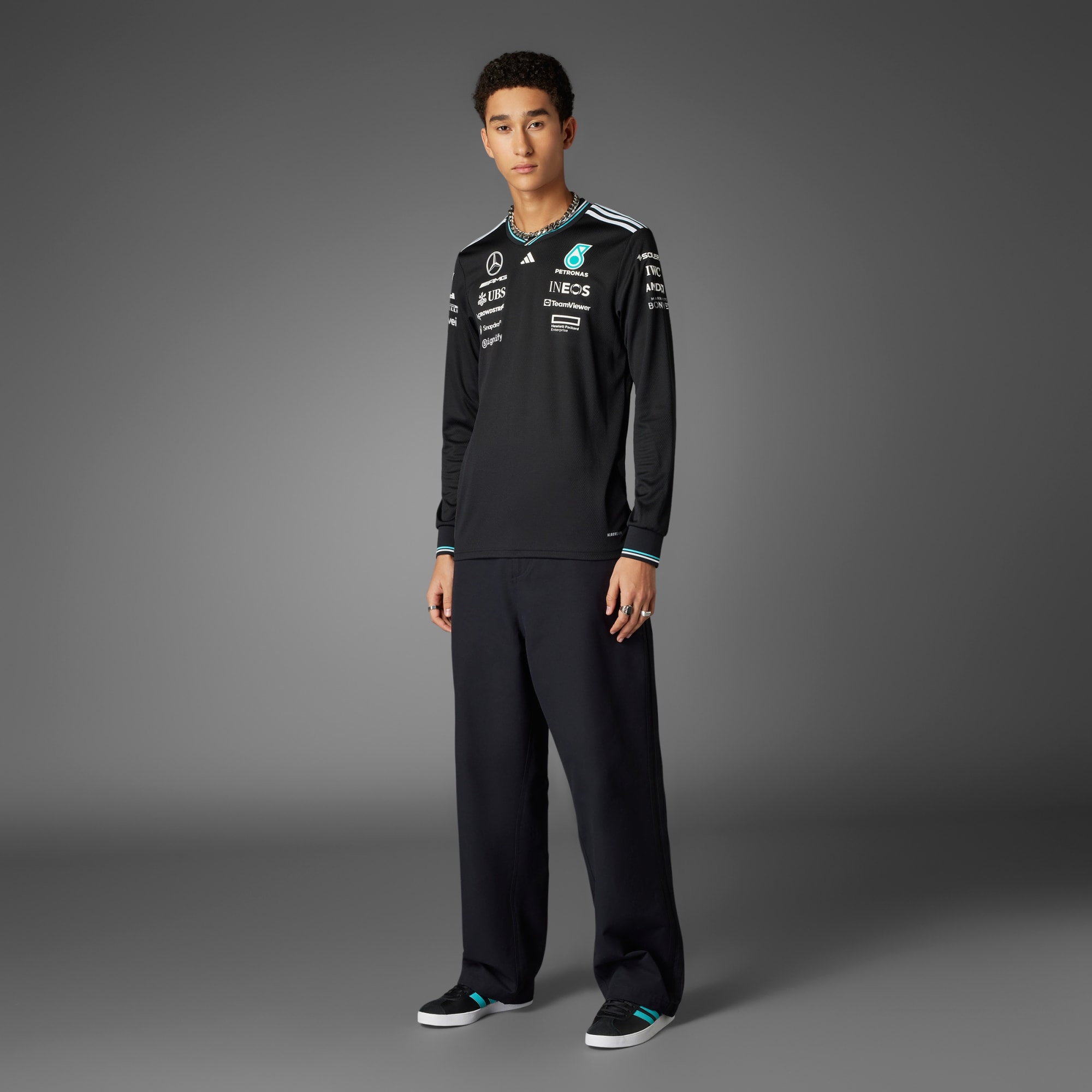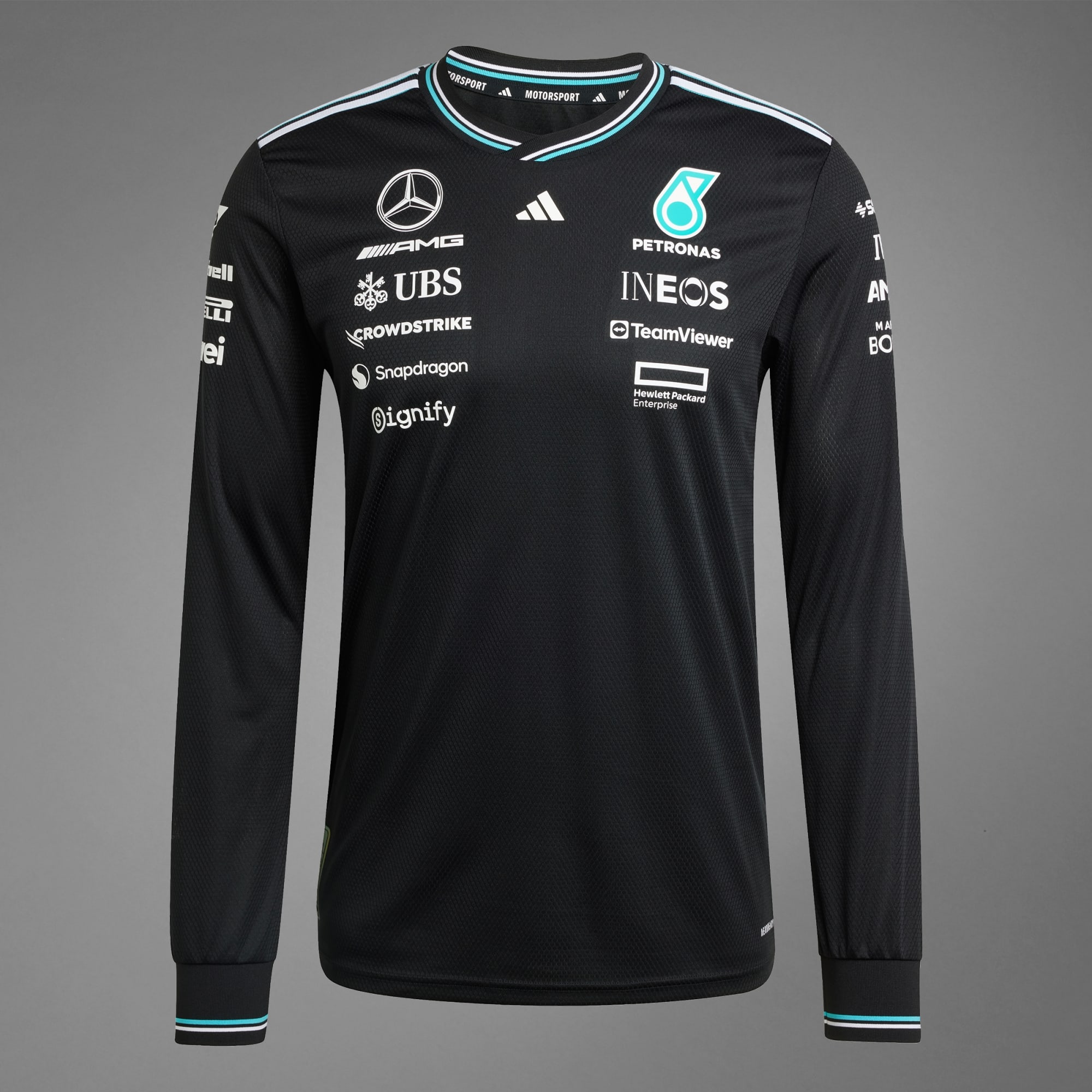 Vær en del af løbet med denne autentiske Mercedes - AMG Petronas Formula One Team-førertrøje fra adidas Motorsports. Det strømlinede, langærmede design lader dig repræsentere holdet. Denne trøje har AEROREADY, der håndterer fugt for at holde dig afkølet og veltilpas, uanset om du ser løbet fra tilskuerpladserne eller hepper fra sofaen. Team- og sponsorlogoer gør looket officielt.
