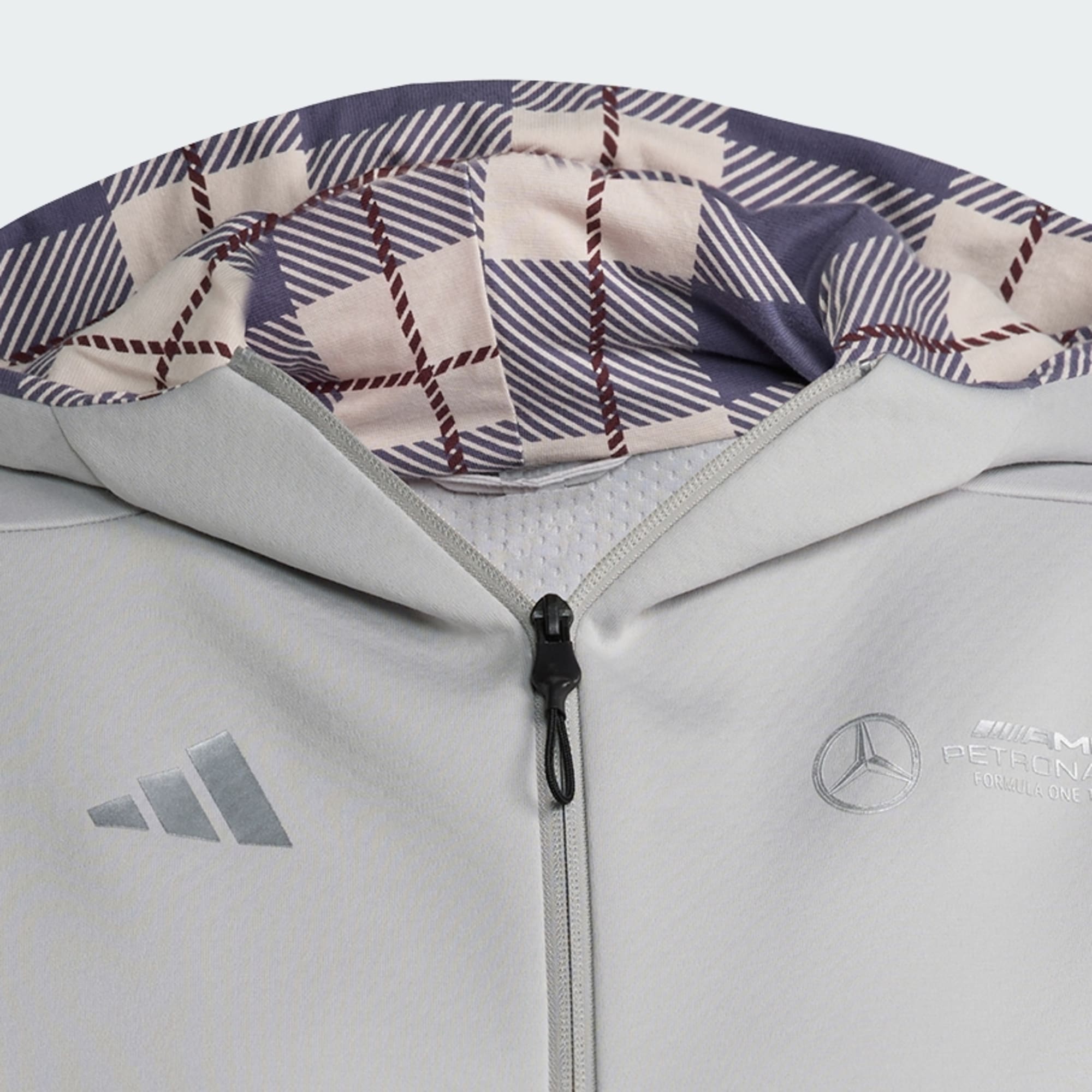 The image shows a close-up view of a gray and black athletic jacket or garment, with the Mercedes-Benz logo prominently displayed on the front.