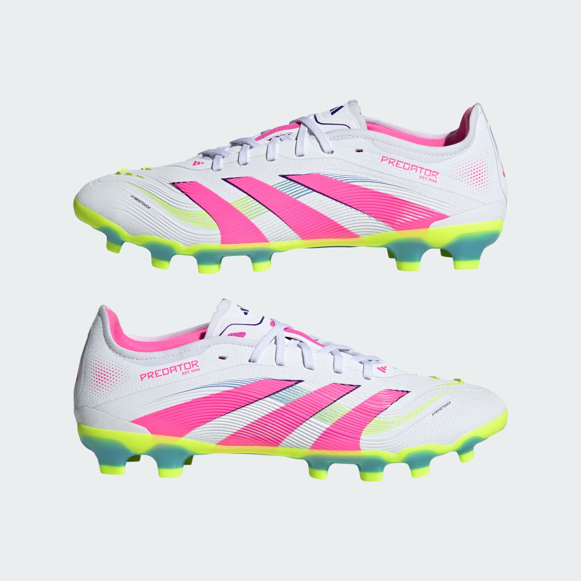 Gå ind til enhver kamp vel vidende, at du kommer til at score i de her adidas Predator Pro-fodboldstøvler. Strikeskin-finner i gummi er strategisk placeret på den bløde, fleksible HybridTouch-overdel og hjælper med hvert skud. Nedenunder giver en alsidig ydersål dig den stabilitet, du har brug for, når du skal se mod forskellige slags baner.