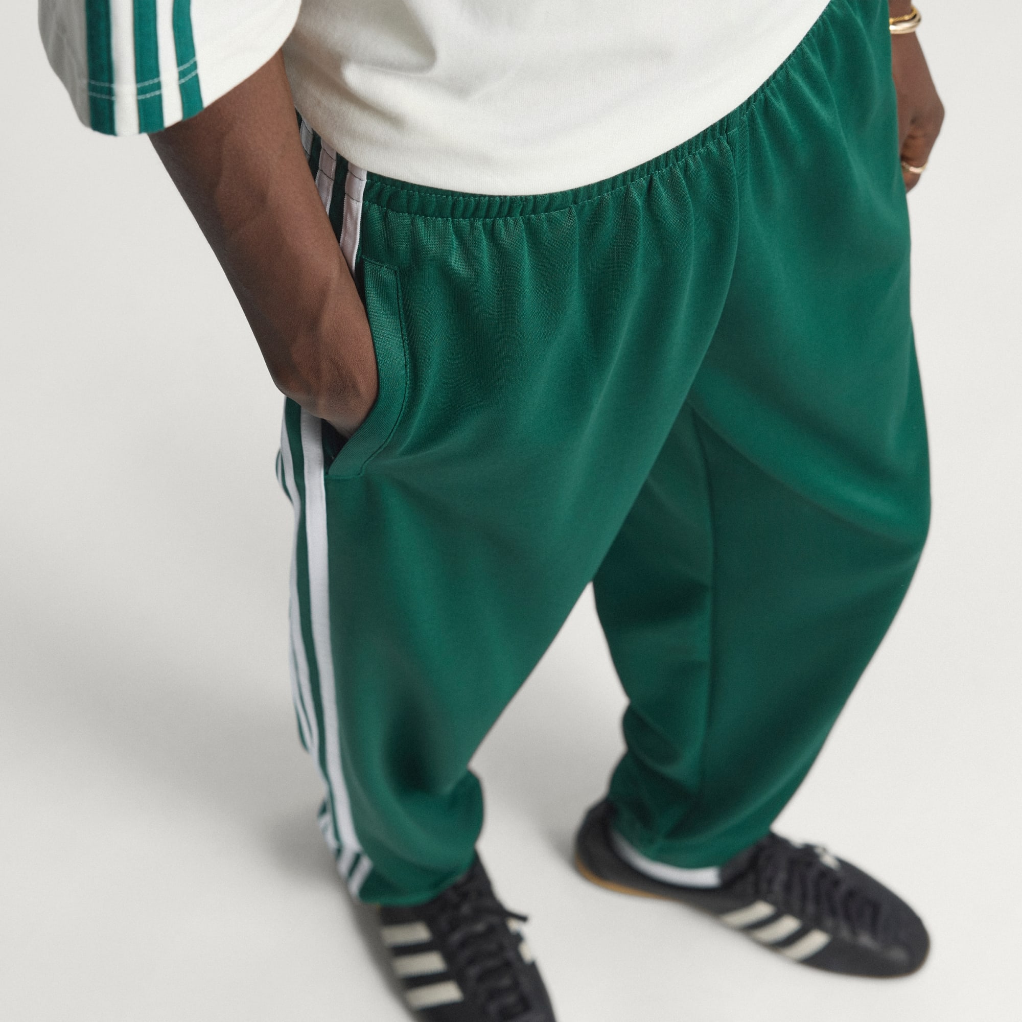Vis din adidas-stil hver gang du tager disse træningsbukser på. Som en del af en kollektion, der er inspireret af fodboldmode, har de et 3 Bar-logo foran og klassiske 3-Stripes ned ad begge ben. De er designet til en normal pasform, så du kan bevæge dig frit. Glat interlock-stof reducerer uønskede distraktioner, og den elastiske talje har en snøre, der giver en sikker fornemmelse. Deres afdæmpede, sporty look gør disse træningsbukser til et godt match med en række forskellige garderobefavoritter, fra t-shirts til poloer og træningstoppe. Så, uanset om du skal i fitnesscenteret eller bare slapper af derhjemme, kan du tage et par på og nyde turen.