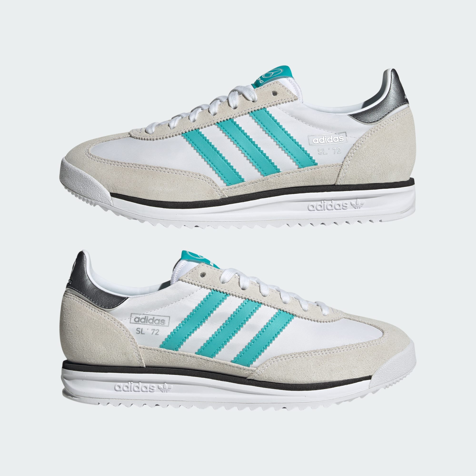 Siden 1972 har SL 72-skoene fra adidas sat deres præg på løbeverdenen. Nu er de gået sammen med Mercedes - AMG Petronas Formula One Team. Overdelen i nylon har bløde ruskindspåsætninger, der skaber et vintagelook, mens en EVA-mellemsål og en rillet ydersål i gummi giver godt greb på underlaget og støddæmper hvert skridt. Disse sko er skabt til at stå distancen, uanset om du er på banen eller på gaden.