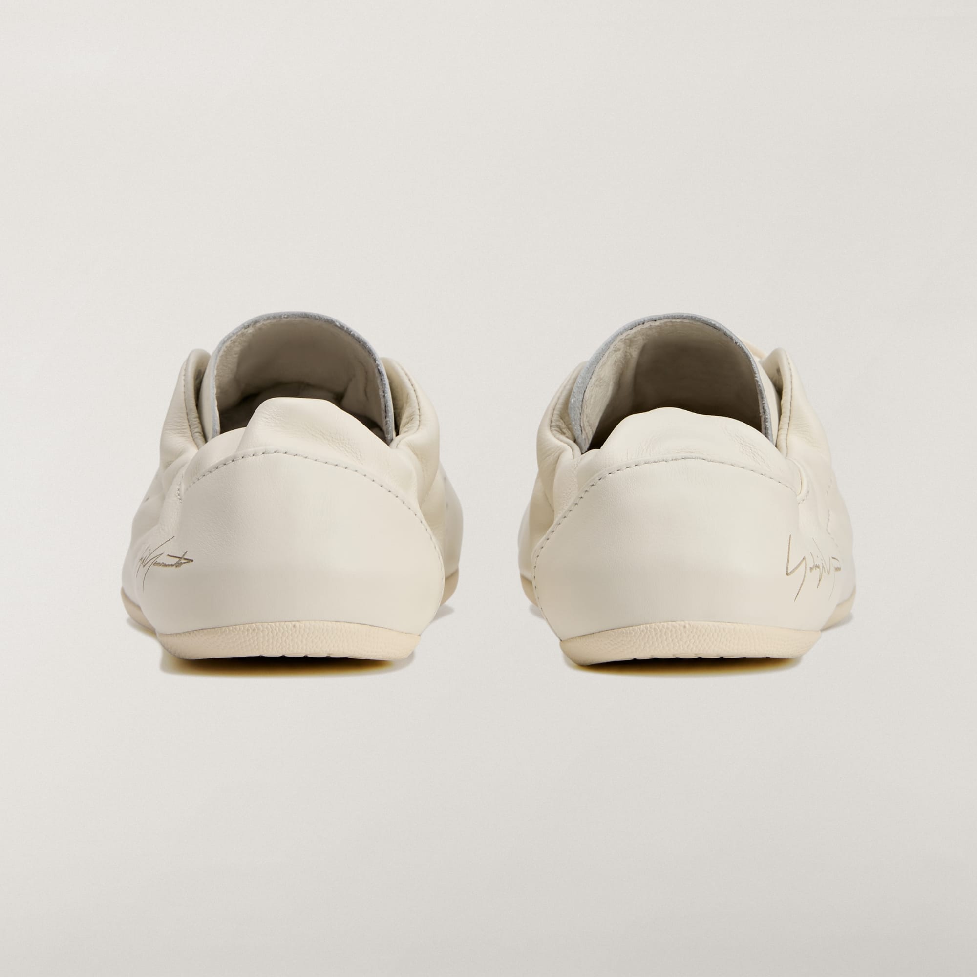Den lasergraverede Yohji Yamamoto-signatur på hælen og Y-3-logoet på pløsen er diskrete nik til kunstneren bag designet.